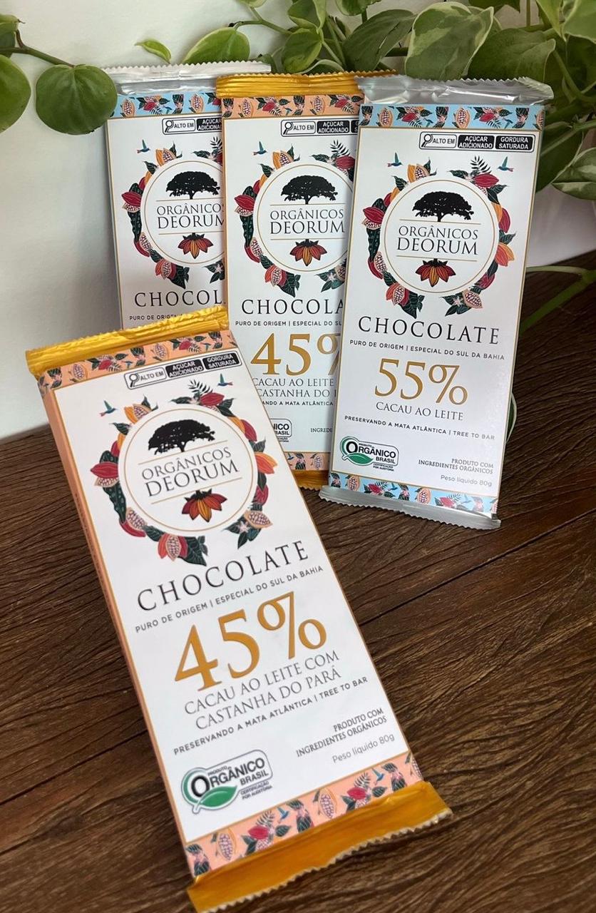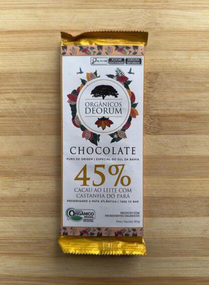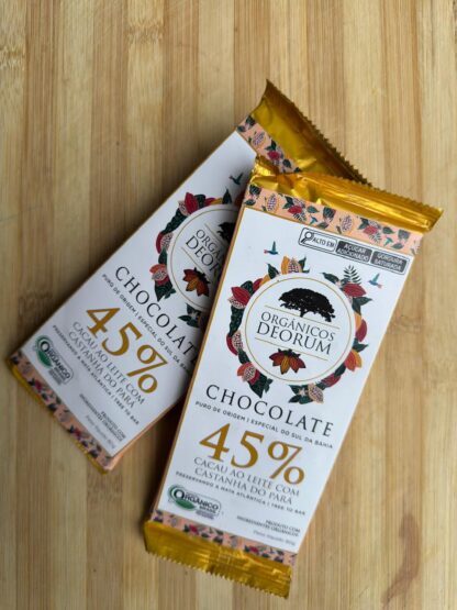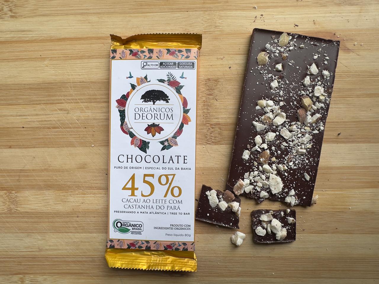A barra de chocolate 45% cacau é feita ao leite e tem pedações de Castanha do Pará, deixando-a, além de cremosa, mais crocante. Fãs de chocolate com castanha certamente vão se apaixonar por essa combinação.